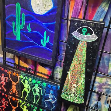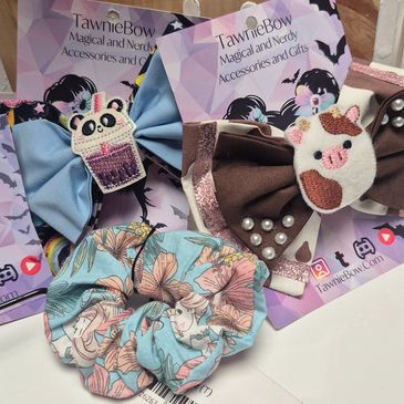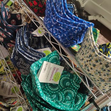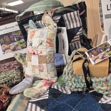 Sewn items - microwave bowl cozies, hair scrunchies, sleep masks, bow ties, lanyard, coffee cozies & wallets.