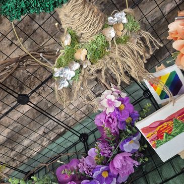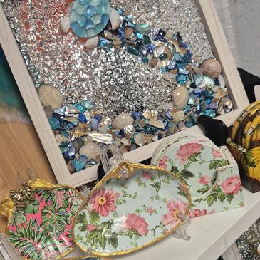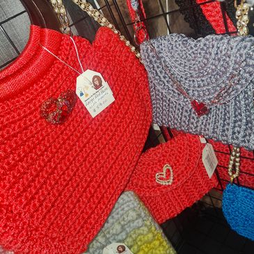 Crochet top towel, crochet animals, pillows, wreathes, home décor and jewelry.